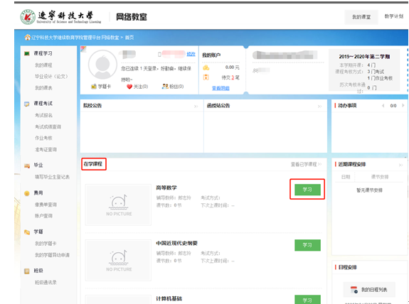 1、登錄后,進入主頁面,找到在學(xué)課程,然后進入學(xué)習(xí)。