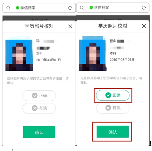 6、如無(wú)誤,請(qǐng)?jiān)趯W(xué)歷照片處點(diǎn)擊確認(rèn),然后告知自己的班主任,已完成圖像校對(duì)。如有誤,請(qǐng)第一時(shí)間聯(lián)系自己的班主任。